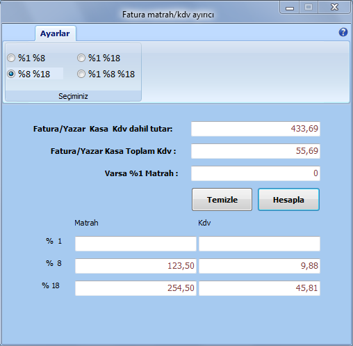 örneğin; elinizde bir markete ait günlük mali döküm var. kdv dahil toplam tutar ve toplam kdv yazmakta. (mali dökümde %8 ve %18 kdv oranlarının olduğun varsayalım.) ilgili mali dökümün muhasebe kaydını yapmak için %8 matrah ve kdv, %18 matrah ve kdv'yi bilmeniz gerekmektedir. Bunu bulabilmek için sayfalarca denklem çözmeniz gerekecektir. işte tam burada program imdadınıza yetişiyor. örneğin; mali dökümde %8 matrahımızın 123,40 olduğunu, %18 matrahımızın da 254,60 olduğunu varsayalım.mali döküme baktığımızda kdv dahil toplam tutarın 433,69, toplam kdv'nin de 55,69 tl olduğunu göreceğiz. şimdi bu örneğe ilişkin hesaplamayı programa yaptıralım.